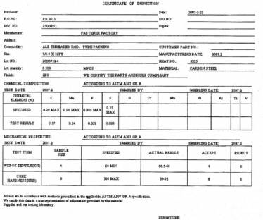 As you can see, there is no yield test performed on this import all thread rod, so it cannot be certified to ASTM A307C.